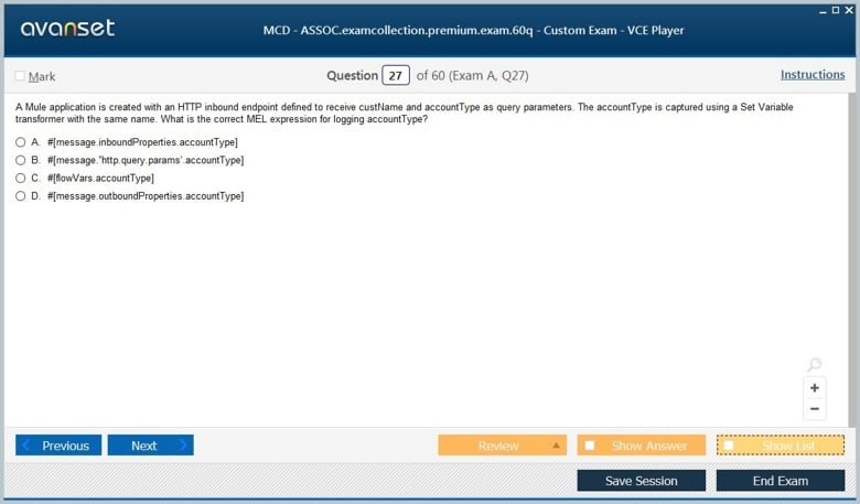 Mulesoft MCD - ASSOC (MuleSoft Certified Developer - Integration and API Associate (Mule 3)) exam dumps vce, practice test questions, study guide & video training course to study and pass quickly and easily. Mulesoft MCD - ASSOC MuleSoft Certified Developer - Integration and API Associate (Mule 3) exam dumps & practice test questions and answers. You need avanset vce exam simulator in order to study the Mulesoft MCD - ASSOC certification exam dumps & Mulesoft MCD - ASSOC practice test questions in vce format.